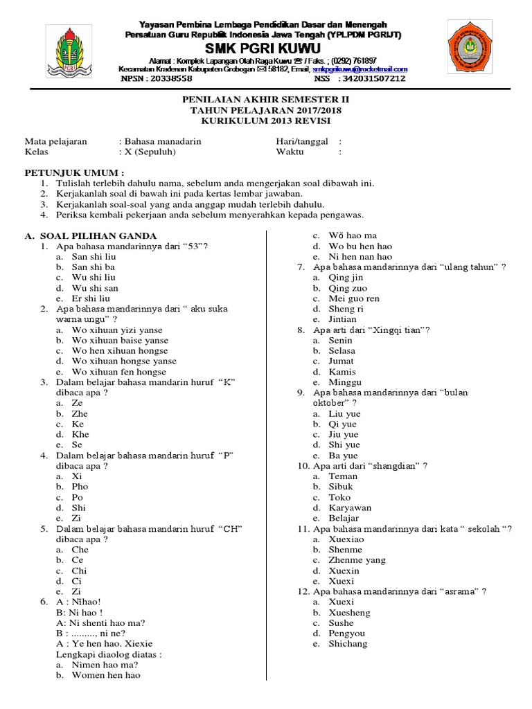 Contoh soal pilihan ganda bahasa mandarin. Contoh soal pilihan ganda bahasa mandarin dan jawahtml. Pada ujian nasional tahun pelajaran 2007 2008 bentuk tes bahasa mandarin tingkat sma ma berupa tes tertulis dengan bentuk soal pilihan ganda sebanyak 50 soal dengan alokasi waktu 120 menit. Tiap siswa belajar bahasa mandarin di sana c.